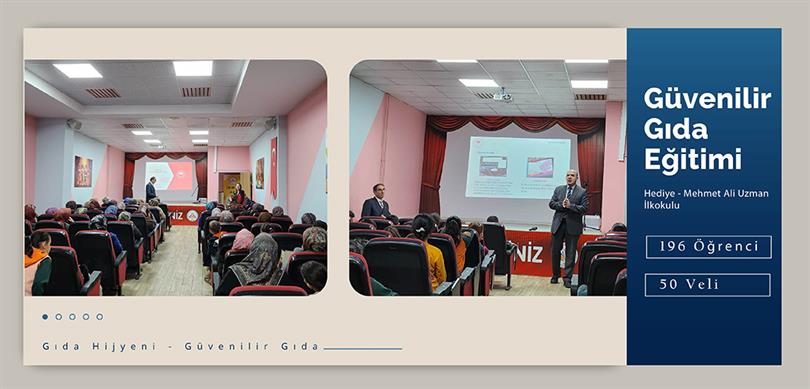 08 Ocak 2026 tarihinde yapılan eğitimde İlkokul 4. sınıf öğrencilerine ve velilere yönelik sunum yapıldı. Gıda ve Yem Şube Müdürlüğünde görevli Veteriner Hekim ve Gıda Mühendisleri tarafından toplam 196 öğrenci ve 50 veliye 3 periyot halinde yapılan sunumlarda, Güvenilir Gıda - Açıkta Satılan Gıdalar - Son Tüketim Tarihi - Anne Babalara Düşen Görevler - Doğru Beslenme - Doğru El Yıkama - Gıda Hastalıkları ve Alo Gıda 174 konularına değinildi.